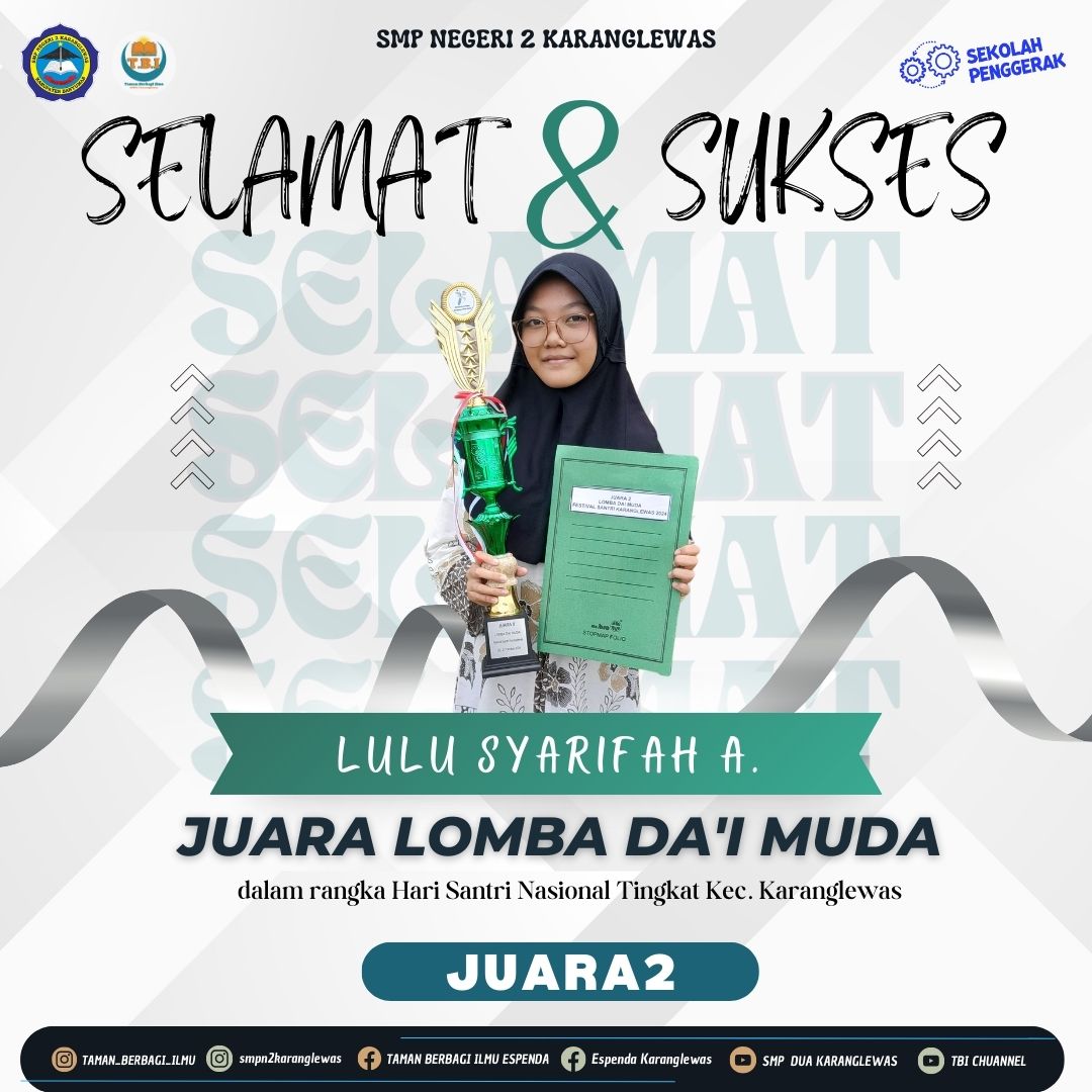 SELAMAT & SUKSES!!! Atas prestasi siswa/i SMP N 2 Karanglewas Juara 2 Lomba Da'i Muda dalam rangka Hari Santri Nasional Tingkat Kec. Karanglewas. Teruslah berprestasi menuju keberhasilan