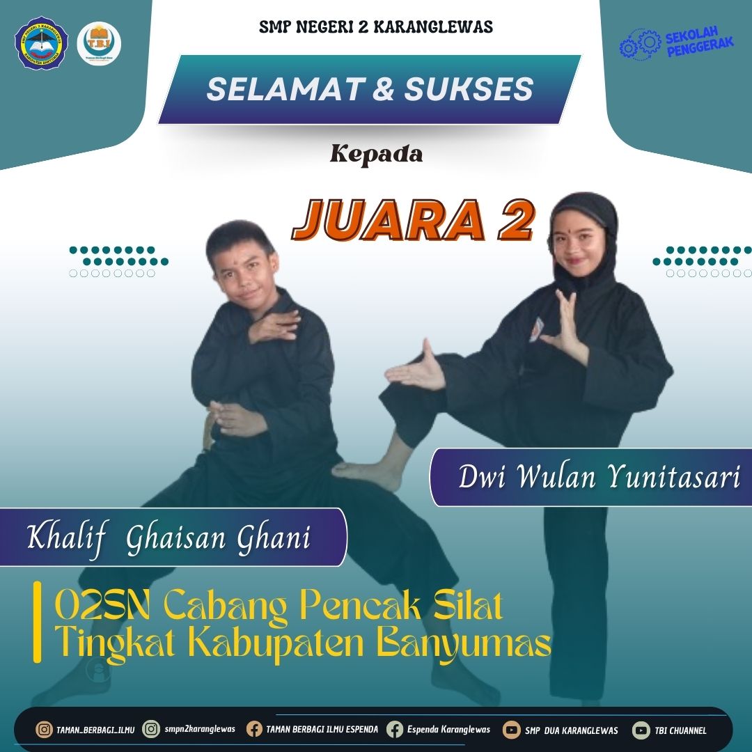 Selamat kepada Siswa/i SMP Negeri 2 Karanglewas dalam O2SN (Olimpiade Olahraga Siswa Nasional) Tingkat Kabupaten Banyumas Tahun 2024 Cabang Olahraga Pencak Silat atas Juara 2. Sukses selalu dan Semoga semakin berprestasi