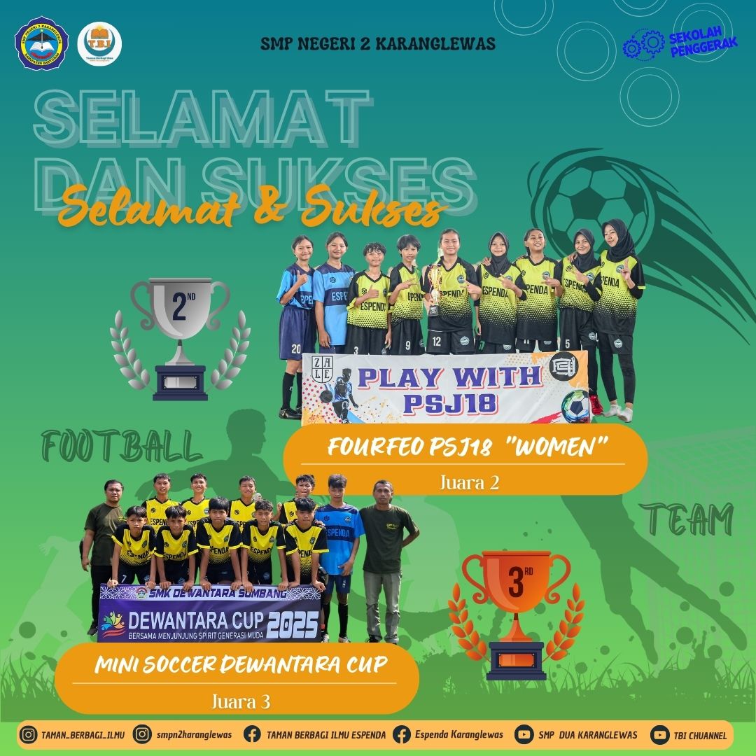 SELAMAT & SUKSES Atas prestasi siswa/i SMP N 2 Karanglewas Tim Sepak Bola SMP Negeri 2 Karanglewas dalam Turnamen Sepak Bola "FOURFEO PSJ18 WOMEN" atas Juara 2 dan "MINI SOCCER DEWANTARA CUP" atas Juara 3 Tahun 2025. Sukses selalu dan semoga semakin berprestasi