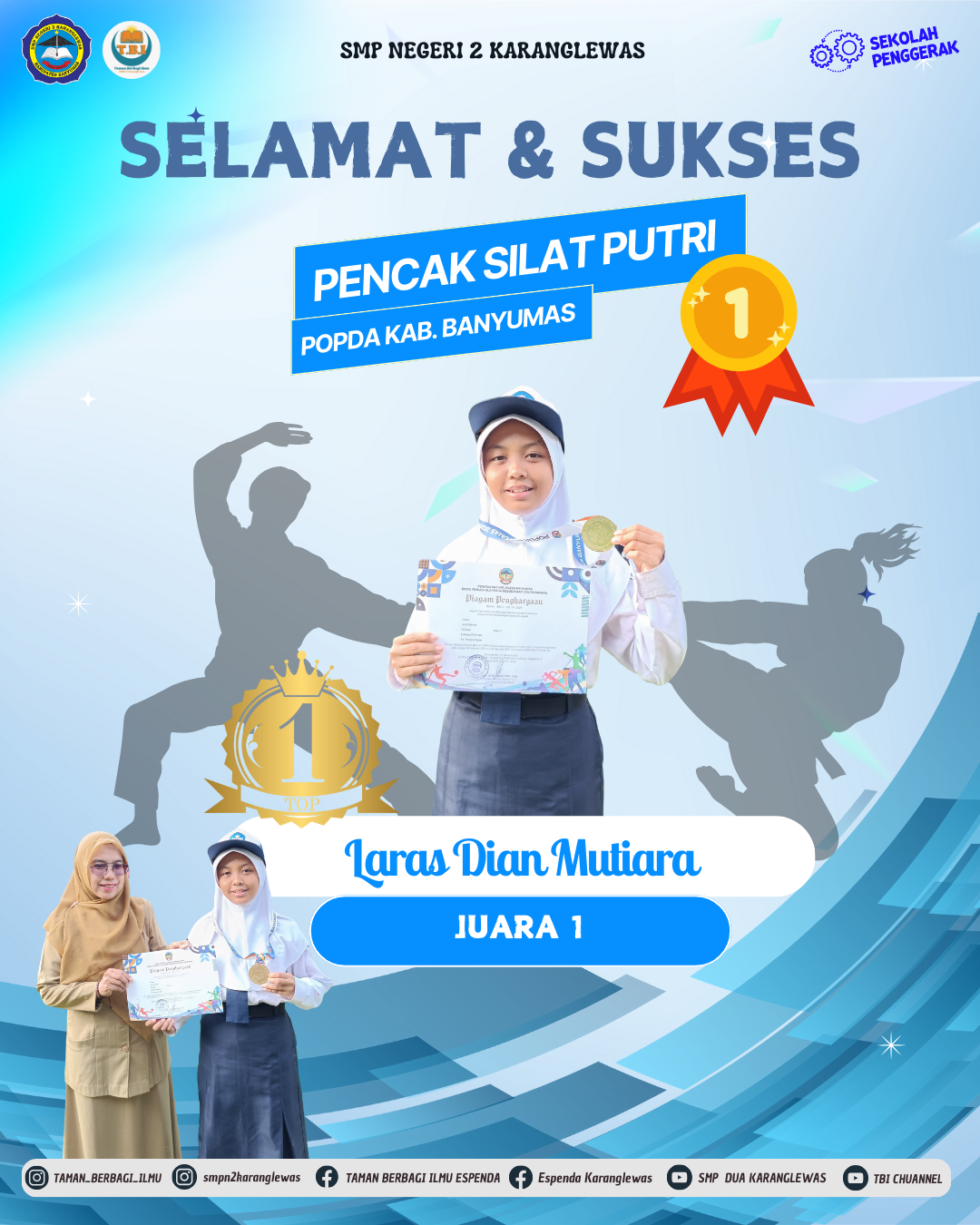 SELAMAT & SUKSES Atas prestasi siswa/i SMP N 2 Karanglewas Pencak Silat Putri SMP Negeri 2 Karanglewas dalam POPDA Kab. Banyumas Cabang Olahraga Pencak Silat Putri atas Juara 1 perolehan Medali Emas Tahun 2025. Sukses selalu dan Semoga semakin berprestasi